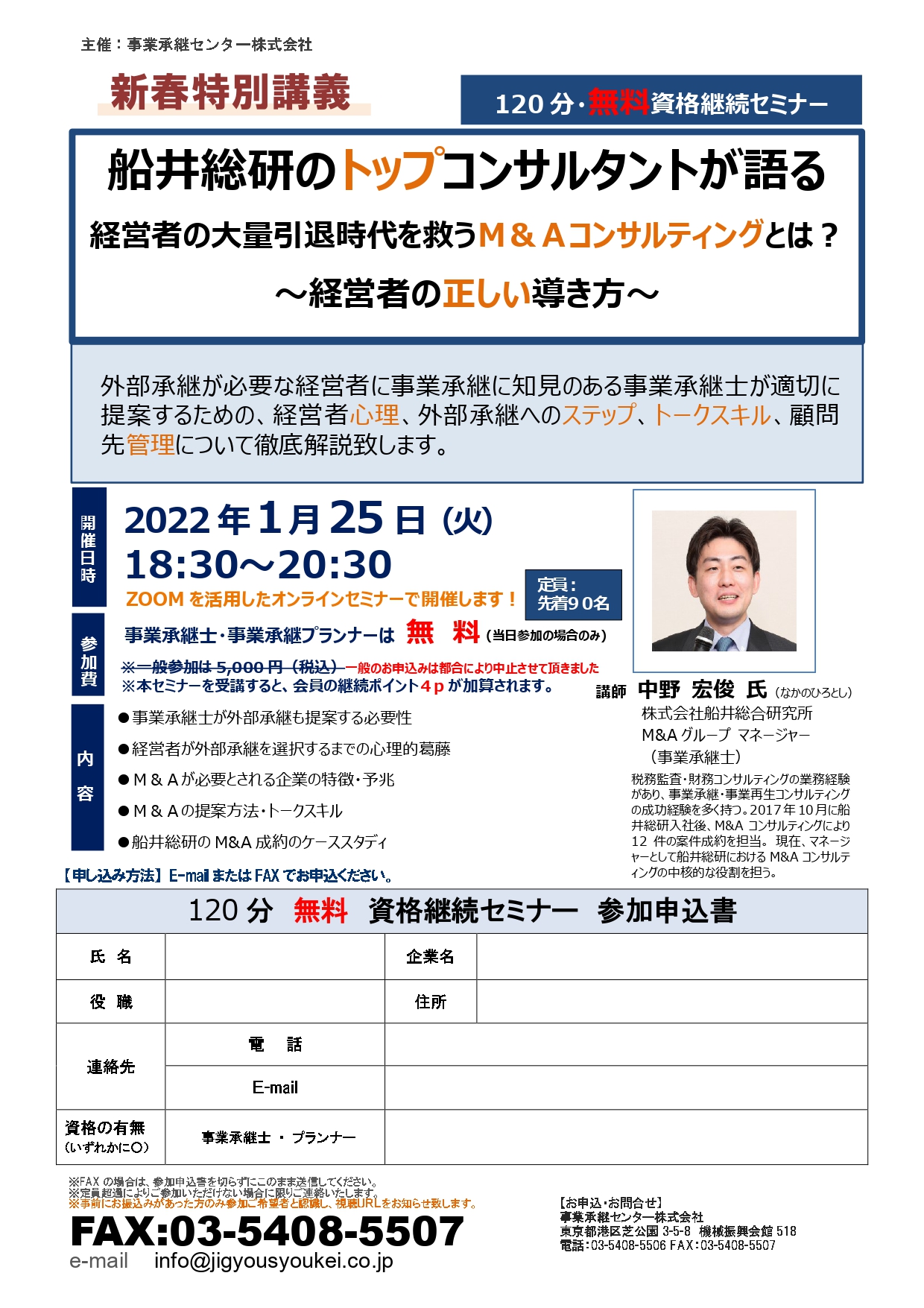 | 参加費 : | 事業承継士・事業承継プランナー 無料 (当日参加の場合のみ) ※後日、オンライン配信を予定していますが、その際は有料になります。 一般のお申込みは都合により中止させて頂きました |