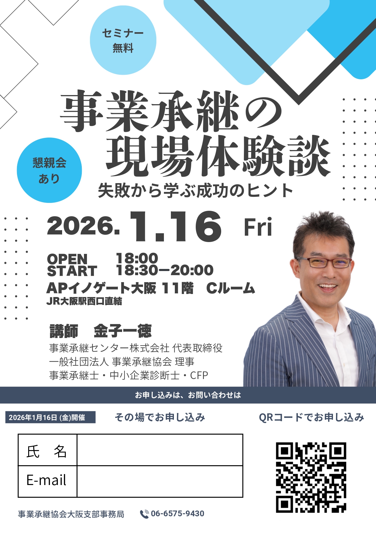 事業承継協会大阪支部主催のセミナー「事業承継の現場体験談 失敗から学ぶ成功のヒント」に、代表取締役の金子一徳が登壇します。
